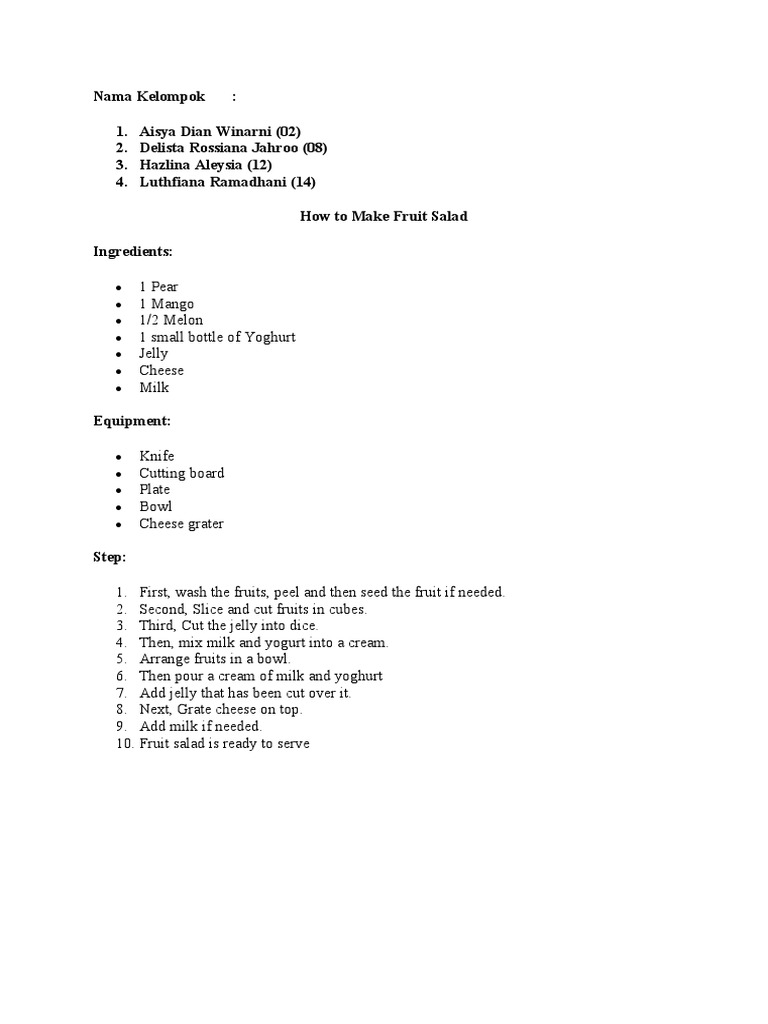 In this lesson, students will discover how fun and delicious it is to make a fruit salad! Gather students in a circle, and ask, what are your favorite fruits to. > photocopy the fruit salad recipe worksheet. They will first guess a series of mystery fruits.