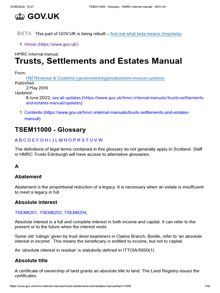 Trusts, Settlements and Estates Manual Glossary HMRC Internal